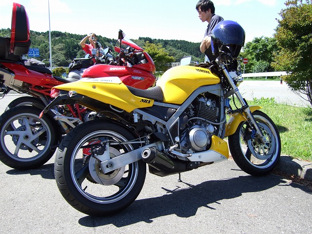 | 限定解除でXJR1300オーナーとなったこけman氏は、今回、仕事仲間とのご参加。 V-maxにCB1300…。この人たちと走るなら、僕も刀号で来た方が受けが良かったかも? 伊豆スカ入口で準備万端のSRX乗りたち。気合充分。 |