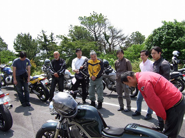 | 亀石でお会いしたDUCATI.netの方々。ムルティ、いいバイクだったなあ…(遠い目)。 イタリアンでぺペロンチーノでカルボナーラな三色ムルティは、jonman氏の愛車です。 おなじみ峠の茶屋で席待ち中のひとコマ。左端の方の表情に注目(笑 全国オフのじゃんけん大会で、見事Simpleさんのなんでも券をゲトされたLED氏。 悩んだ挙句、オリヂナルの3型ハーフカウルをチョイスされたようです。 |