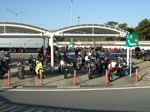 …あれ?なンかブレーキがスカスカしてる。 フルードが漏れているのかとチェックするが、異常なし。 このままでは遅刻してしまうと、慌てて刀を引っ張り出し、暖気もそこそこに走り出す。 首都高は予想していたよりずっと寒かった。油温がちっとも上がらない。 なんだかお腹も痛くなってきたし…。と、集合場所の西湘PAに着く直前、刀のオイル警告灯が点灯する。 やヴぁい…。前日、交換したオイルの量がちょっと少な過ぎたか。 バイクを直立させると、オイルレベルはLOWぎりぎりか、ちょい下ってところ。 うーん、大丈夫とは思うけれど、高回転は控えた方が良さそうだ…。