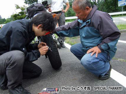 | ヒロセさんのタイアが釘を踏んでる?はいはい出番ですね。 ツーリング時は必ずパンク修理キットを持参しているmakoto@管理人です。えへん。 でも何故か、自分のバイクのパンク修理はしたことがありませんw |