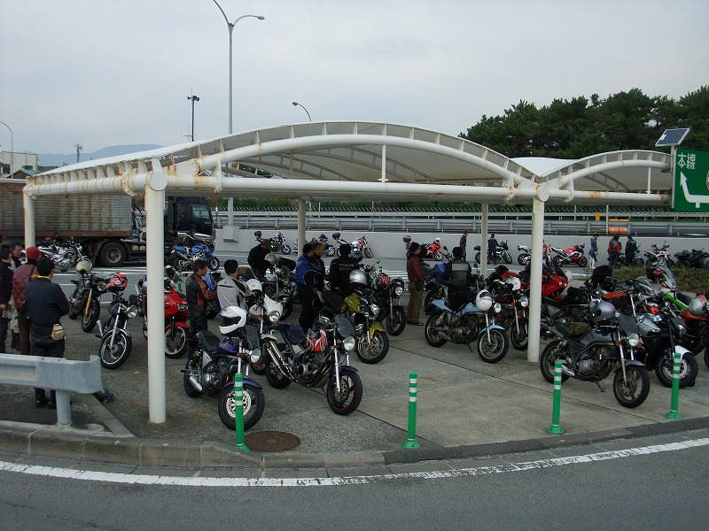 椿ラインの麓にずらりと並んだ参加者たちのマシン。