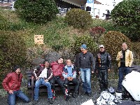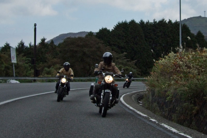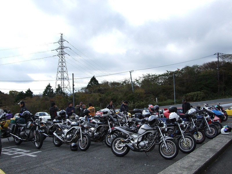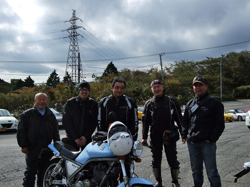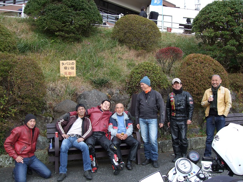 今年はエンジン焼きつきからシーズンが始まった中ー馬ッ鹿氏w いつもマイペース、しかし、メットの下の表情は大まjのヒロタ氏w 大観山のパーキングで仲睦まじく寛ぐman3一行。左から、 |