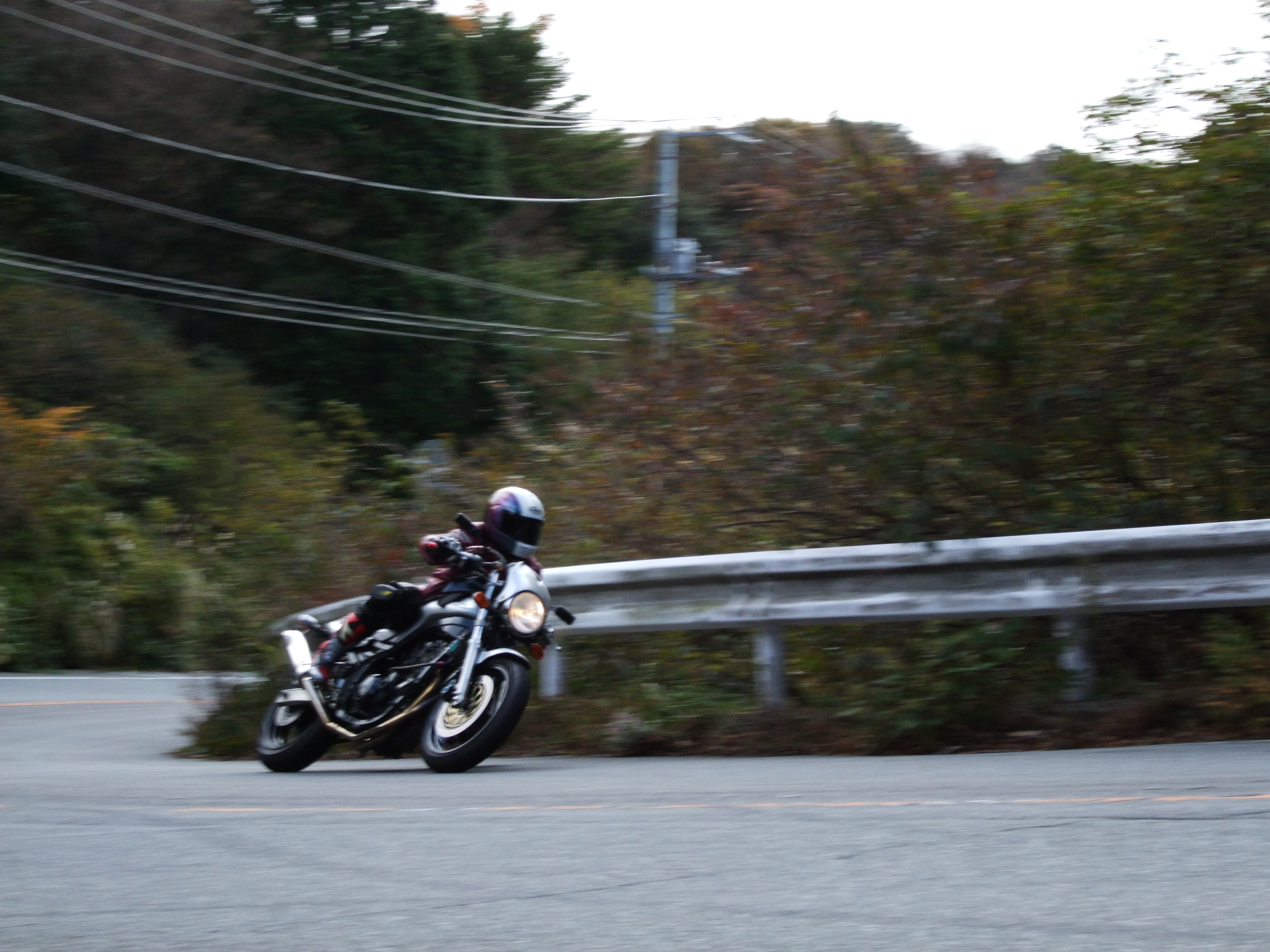 さて、今年の〆の写真は、椿ラインを激走するtakaちゃんでございます。 9月のman3レポで、帰りにサイレンサーがすっぽ抜けてオチにされたことを(かなり)根に持たれていたので、 今回はカコイイ走りの写真を持ってきましたw ちと(かなり)ブレてるけど、これはこれでスピード感あって、いい味出てるでしょ? それでは皆さん、冬の間に風邪など召さぬようお気をつけて。また会う日まで。See You Next!!!