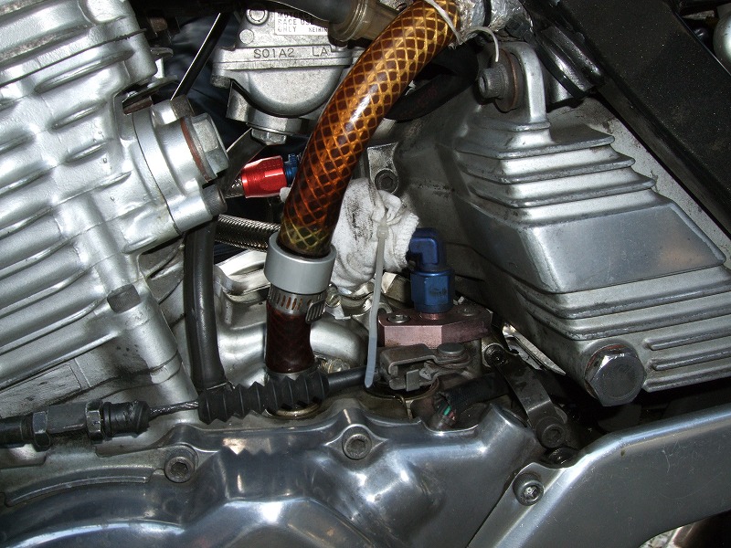 みっきー氏がニードルノーズプライヤで掴んで持ち上げている部品は…。 オイルラインのフィッティングではありませんか。 経年劣化か組み付け時のオーバートルクか…、いずれにしても、見事なまでに真っ二つw |