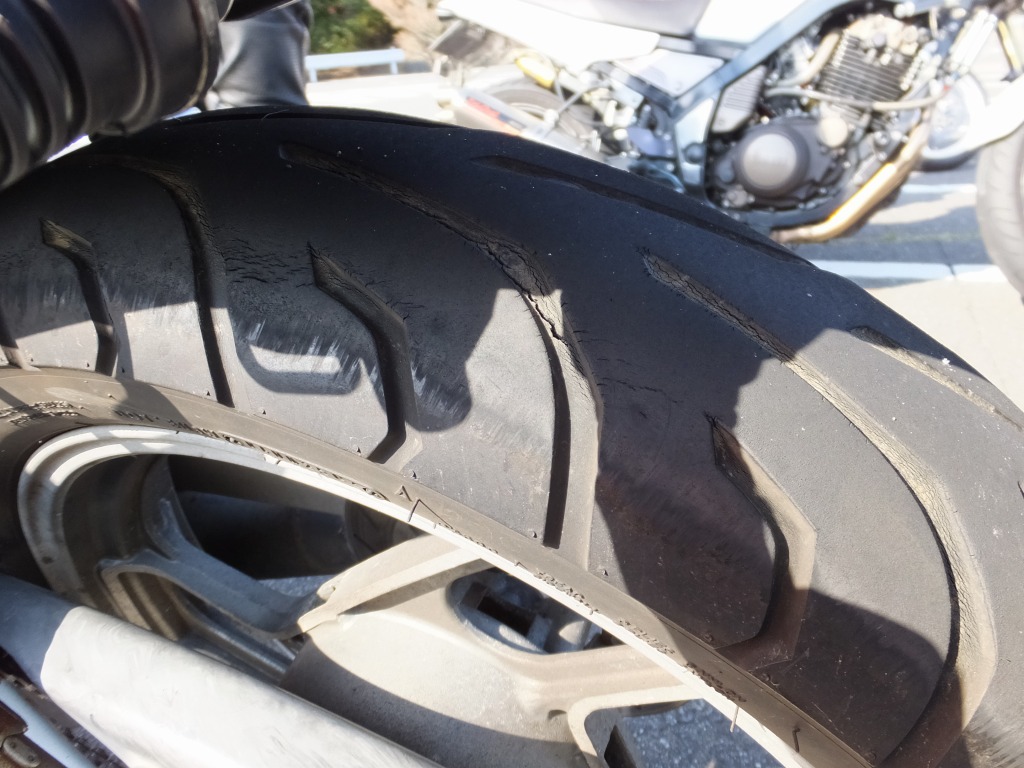 それにしても、特に飛ばすわけでも無理するわけでもないサマンサくんが転倒とは意外です。 タイアの溝がなんだか多いよ!てゆーかヒビじゃん!? 製造年月が2007年(9年前)ですよ! そりゃコケるわw |