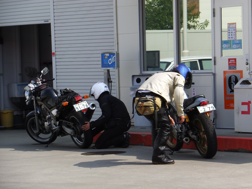 西湘PAから椿ラインの麓までにあるGSでいちばん入りやすくて、 大きいのがこのENEOSなのですが、あっさり満杯w グッドライダーは峠道に入る前に、温間でタイアの空気圧を再チェックするですよ!