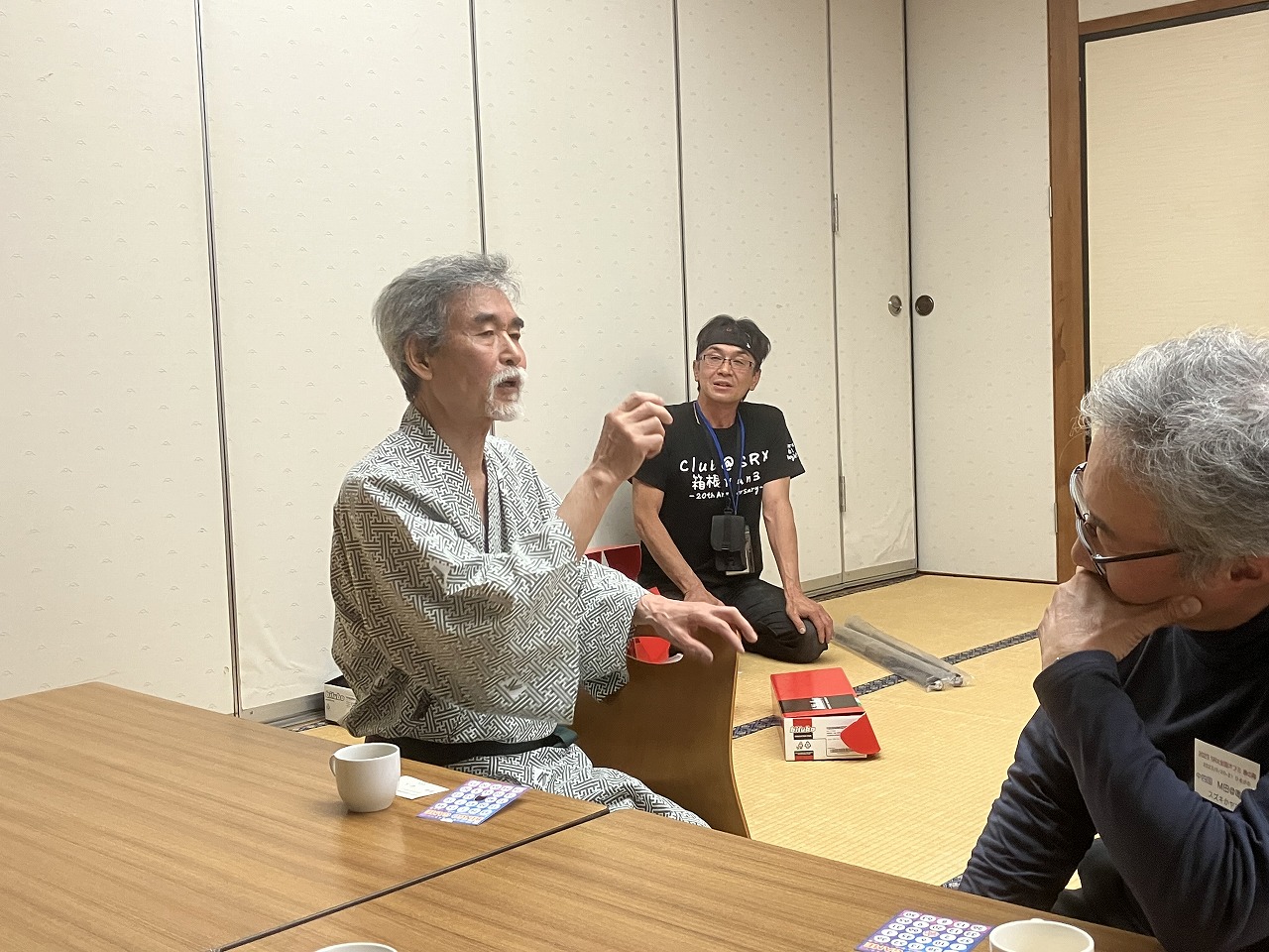 一夜明けて、テラスで駄弁っているところに The Simpleの二川目氏登場。