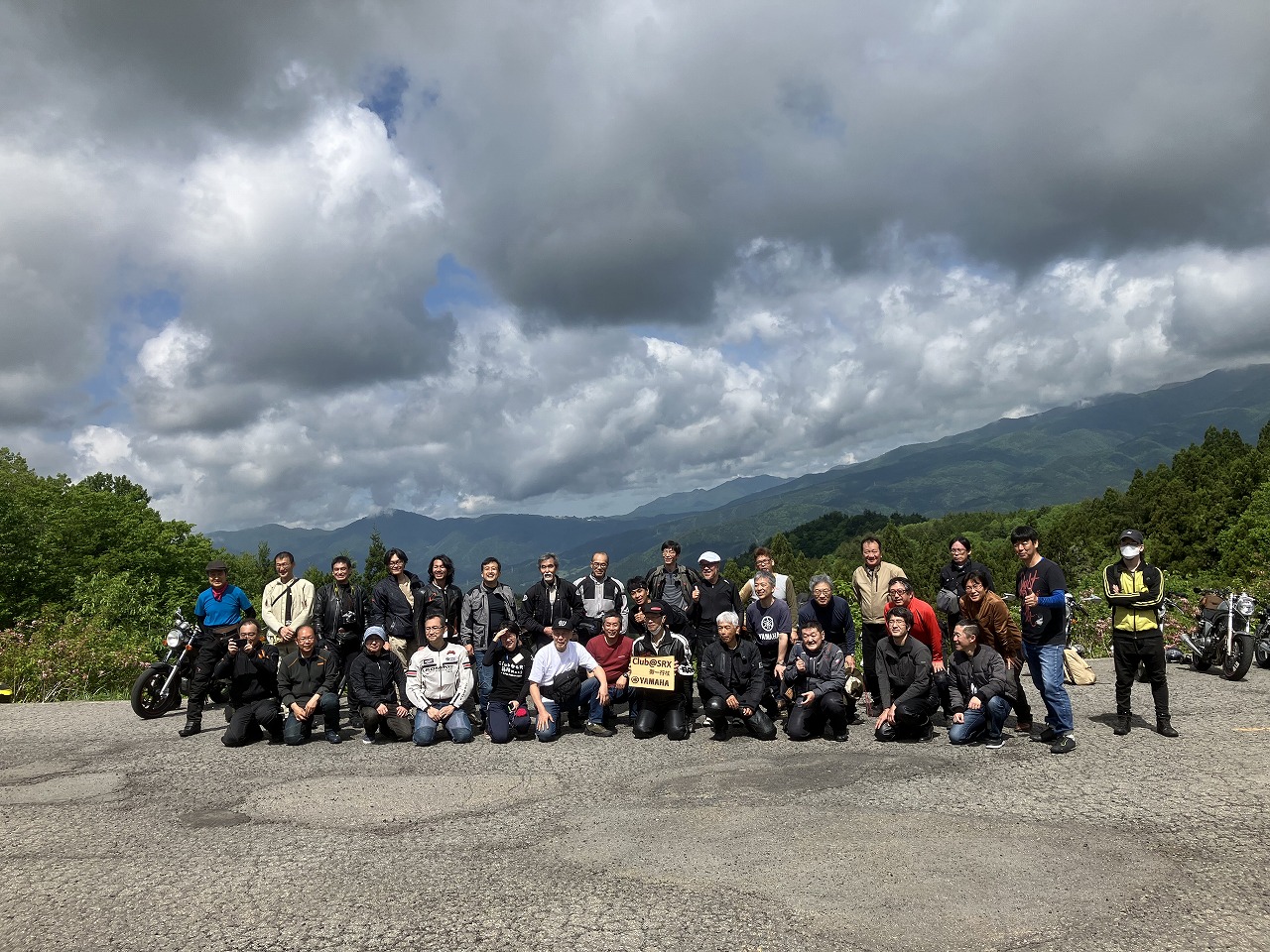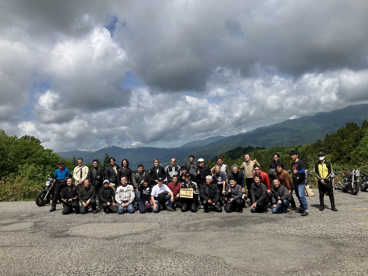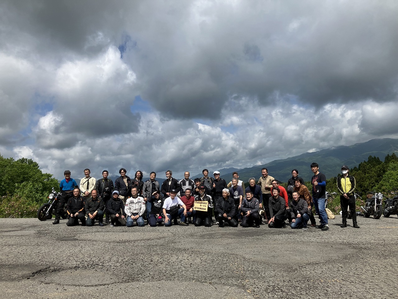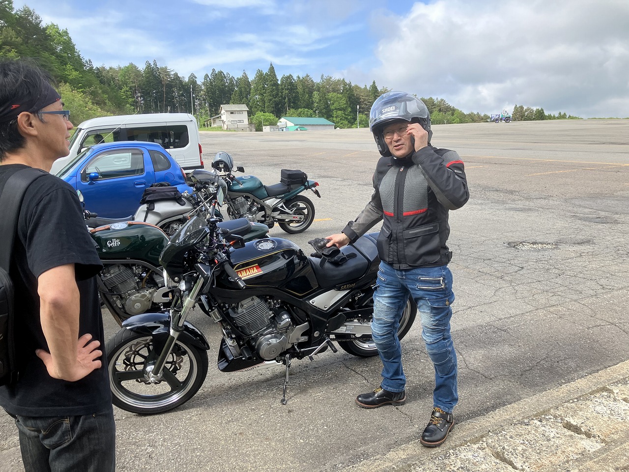 広大な駐車場でバイクを並べて集合写真。似たような写真並べてすみません。