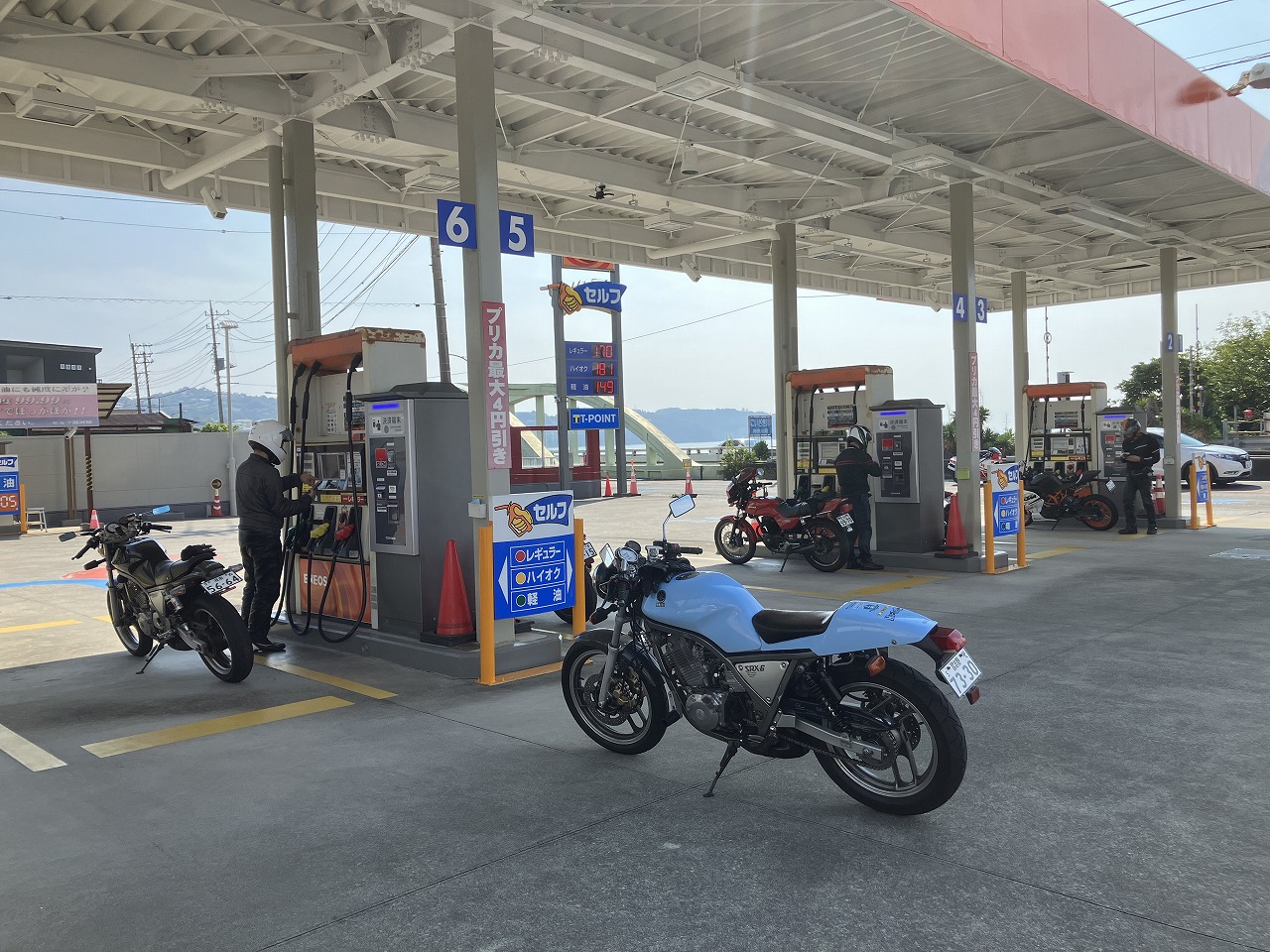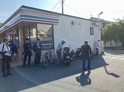 今日も今日とて、集合場所のコンビニで、日陰に地べたの漢たち。 4月のman3では、リアタイアパンクで途中リタイアだった極長@5R氏。 |