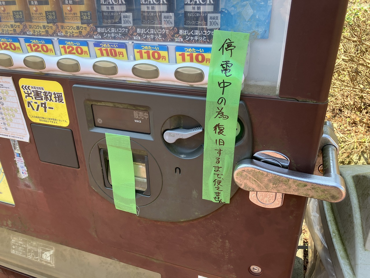 たいふうのつめあと。 「この自動販売機は停電時においても飲料供給ができます」(ほこらしげ) ステッカーチューンですかそうですか。 |