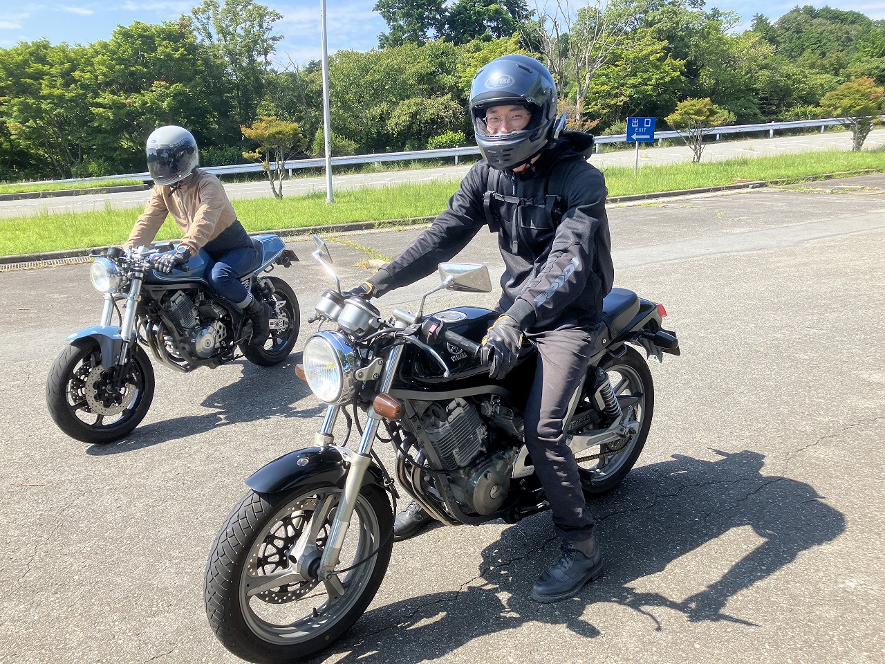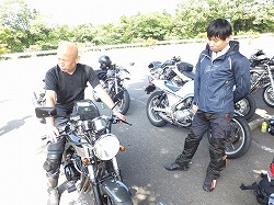 1613氏に試乗を依頼し、サスセッティングのアドバイスを仰ぐベン太郎氏。 「フロントフォークダメ出し貰いました」 ぽよんぽよんですものね(笑) A案:がんがる。