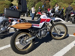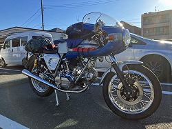 念入りにメンテされた車体と昭和な積載のコラボがイイ感じなTickler氏の900SS。 いまどきの若いこは、タンクバックも網ネットも殆ど使いません(笑) わざわざ伊太利亜から取り寄せたとゆうスポークホイールは三十万円もしたそう…。