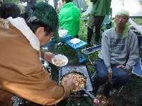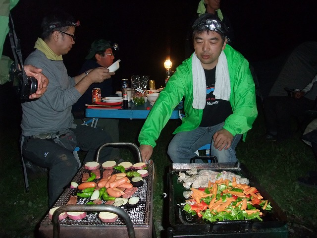 タヌぴっつあんも焼き板奉行ぶりを発揮。肉も野菜もウマーです。最高。