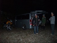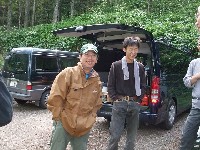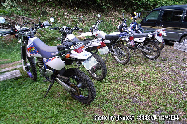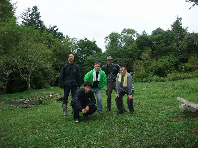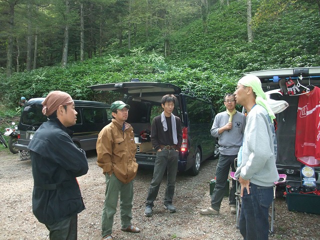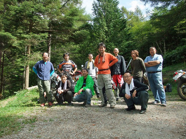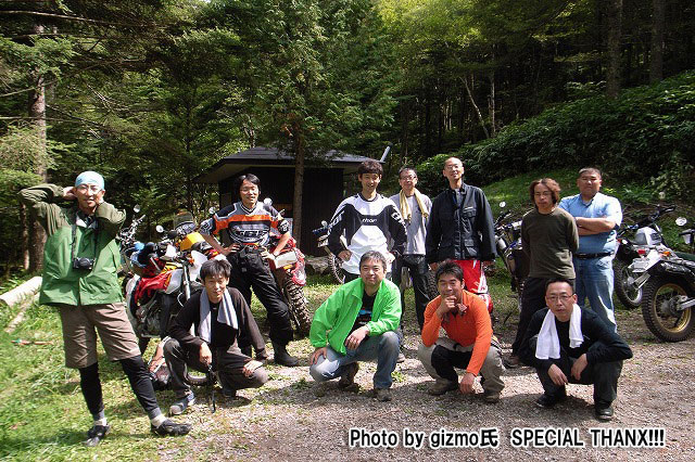 | ところで二日目は何して遊びましょうかね。 まーさん:「風呂入りたいっすよ」 gizmo氏:「しらびそにあるよ」 ゴロー氏:「入笠山の林道通って、しらびそで温泉」 Shinji氏:「でわ、私が案内しましょう」 めっさ遠いから、すぐに出発しないと! …という訳で、撤退組と居残り組が揃っているうちに集合写真です。 トランポ置いてくるため、先に出ちゃったShinji氏が含まれていないのが残念。 |