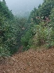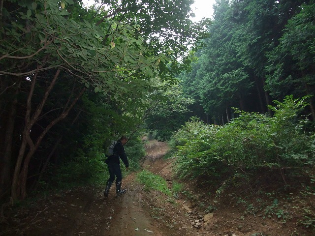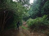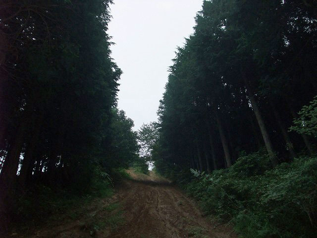 | 写真では伝わりづらいのですが、想像以上の急勾配です。しかも距離がある。 まーさん:「今日はバイクは無理っぽいですが、せっかくだから歩いて上がりましょう」 僕:「まjっすか!?」 朝方の雨もあって、路面はヌルヌル。 斜度のきついところでは四つんばいにならないと上がることができません。 これはさかじゃない。ばかだ。 |