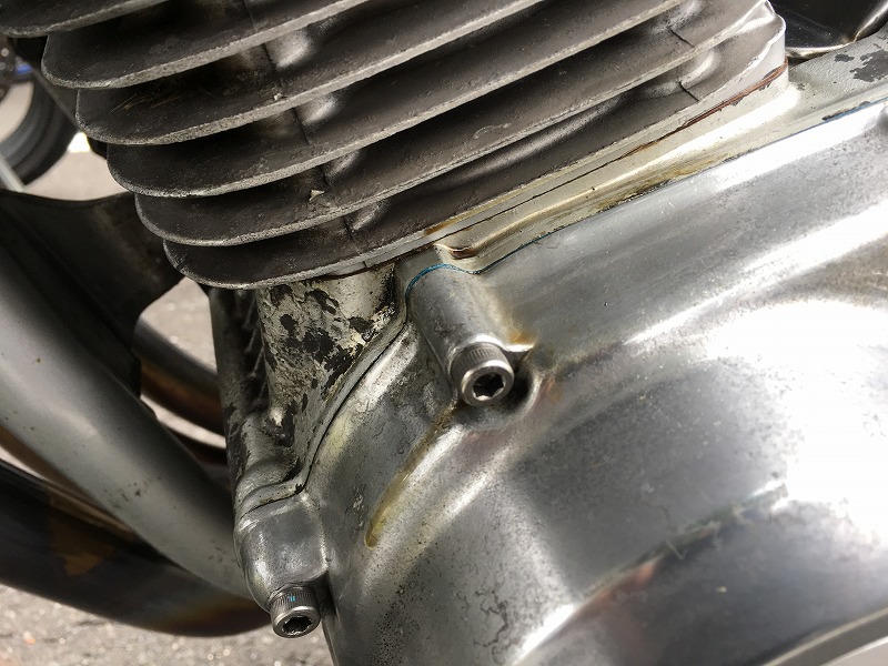 …そして当日の朝。 首都高を降りると、クランクケース左上に一筋のOil痕が…。 ここのOil滲みは、車検のとき気付いていた。 その日のうちにケースカバーガスケットを新品に交換しておいたのだけれど、ダメだったか。 どうやらシリンダーベースガスケットが抜けたっぽい。 シリンダーベースガスケットを換えるということはつまり、クランクケースから上を全バラしなくてはならないってことだ。_ノ乙(、ン、)_ 幸い、まだ本格的には吹いてはいない。 飛撒したOilが、即、リアタイアにかかる場所でもないので、こまめにバイクを止めて、 滲んだOilを拭き取りながら走れば、一日くらいなんとかなりそうだ。 ジンクスじゃなくOilを払拭しながらツーリングする羽目になった。