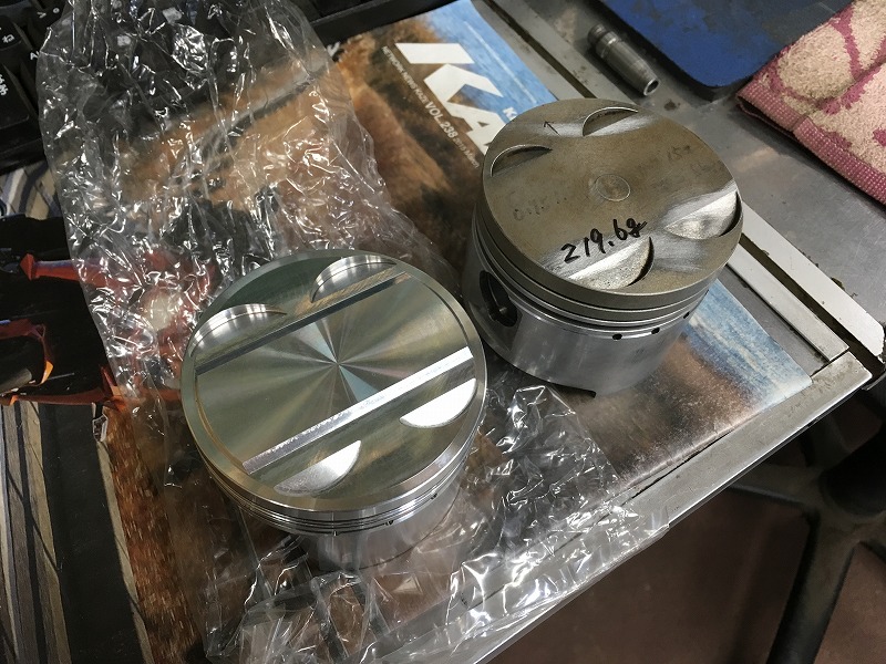 ・SOHC製73mm(圧縮比11.5)と比較用に持ち出されたノーマルピストン。「Wisecoなんかと比べないでくれる?」と渡辺さん。