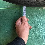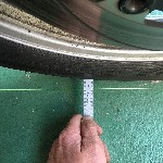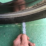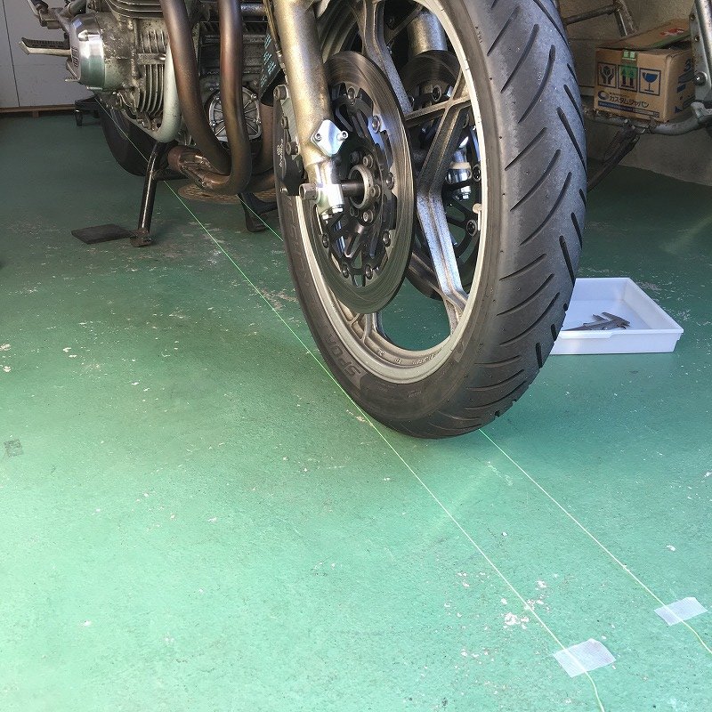 用意する水糸の太さは0.3mm。長さは5〜6m程度。 フロントタイアのエッジから定規を当て、張った水糸との距離を測定する。 こんなイメージです。 僕のバイクは前後タイアの整列が出ているにも関わらず、ハンドルの角度が左右で違っていた。 |