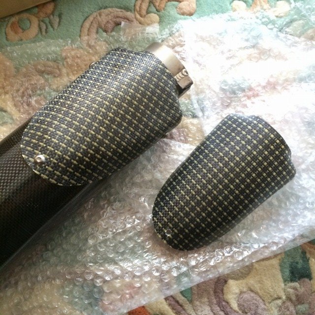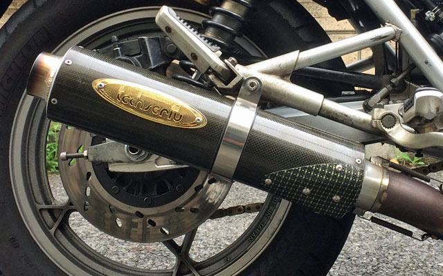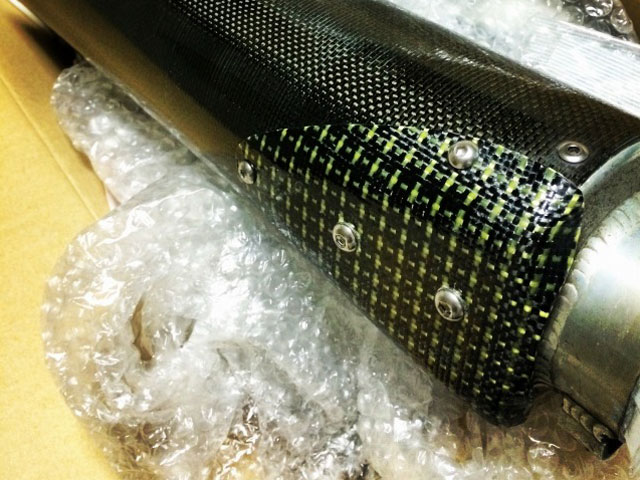 カーボンケブラー樹脂製のサイレンサーカバーですよ。 昭和の子どもたちは破けたズボンにこんなパッチ当てて鼻水垂らしながらヒャッハー言うて走り回ってたよねw ボルトオンで、蓋だけ交換可能な造りになっています。 削れて傷んだらまた対応してくださるそうで、恐れ多いやら嬉しいやらありがたいやら。 中央のボルトは、スライダー装着を検討した名残らしい。 てきとうな素材が見つからずそのままですが、 結果的にこいつのおかげで路面に接地するときの感覚が掴みやすくなっています。 「ガリガリィッ!」て、結構激しい音がするんだ。 チタン製のボルトに交換すれば、ロッシばりに火花散らしながらコーナーを抜けられるよ。