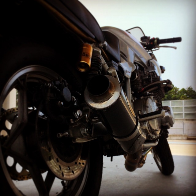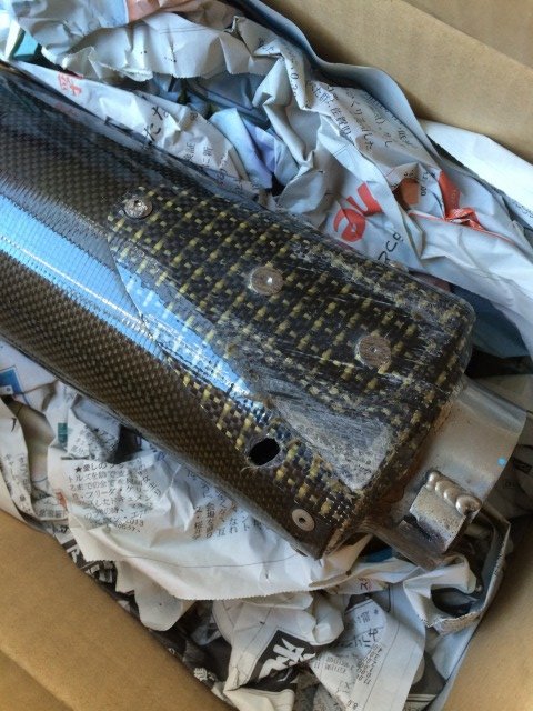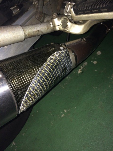※注:転んでません。 袖3〜4回走ったら、下側のボルトがトンでっちゃったw 平らなカバーは角が当たりやすく、そこから先にダメージを受ける。 サスの入り方やコーナーの深さで当たる場所がビミョーに変わるので、路面を面で捉えるのは意外と難しい。 予め差込口に印をつけて、きっちり位置決めして組み直したつもりだけど、 集合管は金属のパイプを差し込んで繋げて、サイレンサーステーでぶら下げるだけの簡単な構造だから、 接地の衝撃で動いてしまったのかもしれない。 もちろん排気漏れしまくりの爆音w もう少し持たせることもできないではないけれど、 このままシーズンインして、暖かくなってから修理に時間を取られるのは勿体ない。 またも (ずうずうしく)THE SIMPLE さんのご厚意に甘えてしまうのでした。