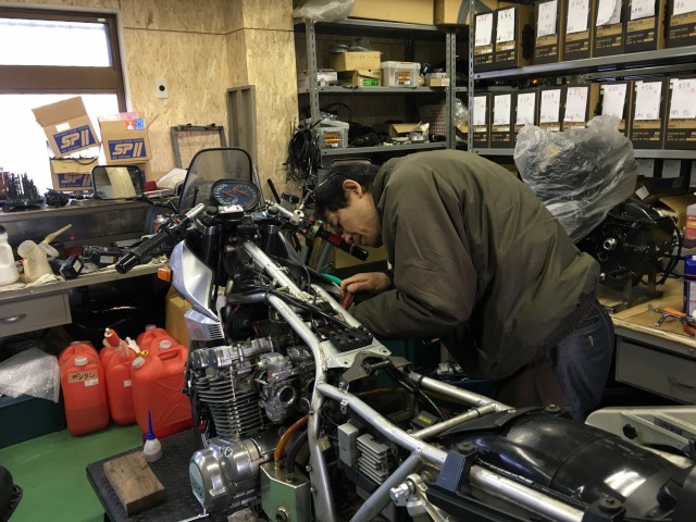 久しぶりの再会に旧交を温める会話をひとしきり済ませると、 「そろそろ始めましょうか」と、手慣れた手つきでキャブの交換作業を始めるまめしば氏。 あたりまえだけれど、僕が同じ作業をしたら倍以上の時間がかかります。