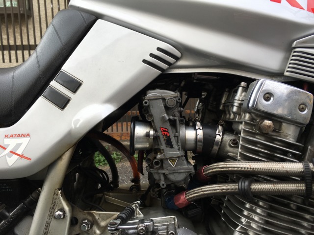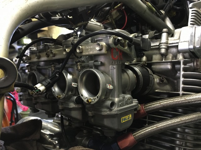 画像はCR-M33です。 FCR同様、CRにも小排気量用のスモールボディと、大排気量用のラージボディがあります。 33はスモールボディの最大口径で、35はラージボディの最小口径。 このCR-M33は、まめしば氏がご自身のKZ900LTD用に組んだもので、高剛性連結ステーとTPSが装着されています。 僕の刀は旧式のアナログ点火なので、TPSは使えません。 そのため、試乗時はコネクターが宙ぶらりんになりますが、まったく無問題。 刀でTPSを使うためには、点火方式を国内仕様のデジタル式に交換して、 まめしばファクトリー謹製スペサルマッピングが入ったウオタニのコントロールユニットを組み込む必要があります。 レーシングキャブの試着試乗なんて前代未聞ですよね? 世界中捜しても、そんなんさせてくれるとこなんて何処にもないんじゃないかと思います。