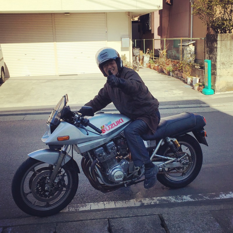 CR-M33のフィッティングを済ませ、僕のマシンに跨って試乗に出て行かれるまめしば氏。笑顔がいいよねえ。 ポン付けで、軽くアイドルを調整しただけの状態です。 FCRならともかく、CRでこれができちゃうてのは、なかなかにすごいことなんですよ。