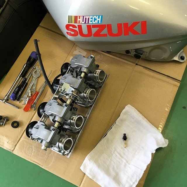 当日、たまたまファクトリーに居合わせたTsuruさんが、 僕の刀のアクセルを握ってひとこと。 「これ、スロットルを開けていく途中で"ゴリッ"とするね」 「まjッすか!?」 僕自身は気付いていなかったけれど、 確かに開度1/8辺りで僅かに抵抗が大きくなるポイントがある。 競ってる? 「MJ締め過ぎて中子がズレたとか歪んだとか…」 「その可能性もあります」 「バラシてチェックしましょう」 加工済のスタータープランジャを組み、 車体に取り付けたばかりのキャブを、すぐさま外す羽目にw 「すぐ外せるでしょ?」 「ええまあw」