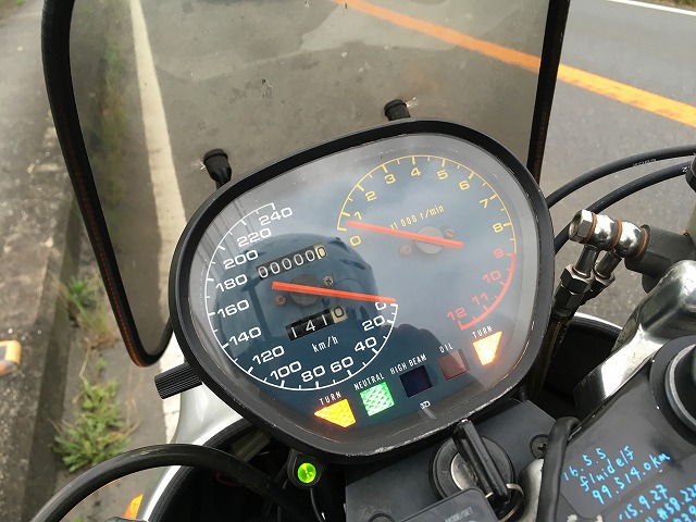 そしてこの日、僕の刀がとうとう新車になりました。 ぱちぱち。 今どきのバイクはデジタルメーターが主流で、 しかもキロが6桁表示だから、10万kmでゼロクリアなんてことはないみたい。 18年前に中古でこのバイクを手に入れたとき、走行距離は1万7千kmくらいだったから、 年間5千km前後しか走ってないことになる。意外と乗っていない。 メーターがオールゼロになったら、記念に新品のマイルメーターを奢ろうと思っていたんだけれど、 今や新品で7万円越えのプレミアムパーツ…。 そんだけあったら、おにぅのフォークスプリングとタイアをゲトしてOil交換もできる。 このメーター、折れた針を二回自作しているんですが、 どうも針が重過ぎるようで、タコがアイドリング拾わなかったり、示される回転数も割とめちゃくちゃですw サーキットだと1万1千rpmくらい回転っちゃうからね。 ノーマルでそんなんある筈ないでしょ。 まあ、メーターなんて正確じゃなくてもちゃんと走れるからいいや。(ああだめなひとね)