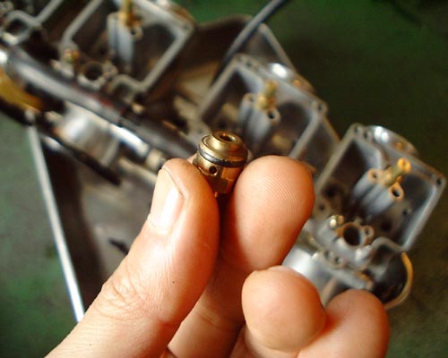 赤い矢印の部分にあるフロートバルブシート。放っておくと、この奥にあるOリングが固着してしまうとのこと。