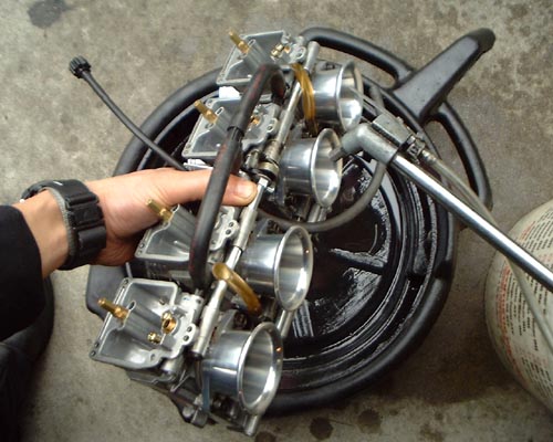 ウォッシャーを借りて、キャブを丸洗いする。逆さにして洗っている点がポイント。