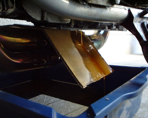 廃油を受けるバットの底には、スラッジがそこはかとなく沈んでいる。オイルパンまで剥ぐっても、尚…。