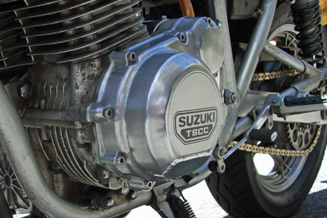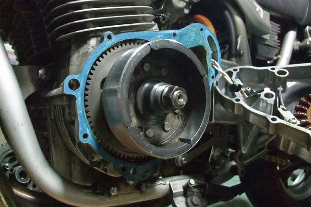 カワサキの空冷Z系エンジンは、フライホイールがステーターコイルの内側にあるインナーローター式。 インナーローター式は、本来、ピックアップや高回転域でのパフォーマンスを重視したレース用エンジンに採用されることが多い。 この方式だと、(発電量は落ちるものの)ステーターコイルを削ることでケースカバーのカット量を増やして、 バンク角を追い込むことができる。 対して、スズキGS/GSX系エンジンはアウターローター式で、 フライホイールはステーターコイルの外側だ。 安定した発電量と低中速域の扱いやすさを確保できるため、市販車の殆どはアウターローター式である。 しかし、前述したとおり、純正のフライホイールは削るとすぐに磁石が出てきてしまうため、 外周はせいぜい1〜2mm程度しか削れない。 僅か1〜2mmのために、今付いているカットカバーを(更にお金をかけて)再加工するメリットはなさそうだ。 --- でも、加工屋さんはせっかくだからと、