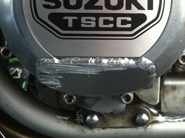 サーキット遊びで刀のバンク角不足が問題になって、クランクケースカバーを加工したのだけれど、 写真で見てもわかるとおり、それによって稼ぐことができたバンク角はほんの僅かだったりする。 加工後は先にサイドスタンドが接地するようになったから、 サイドスタンドが当たったら、そこでバイクを寝かすのを止めればいい…のだ……が………。 そんなこと言ってる矢先に、あっさり擦ってしまったorz