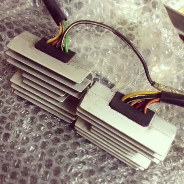 帰りの高速で、電圧が11V前後までしか上がっていないことに気が付いた。 「あちゃー、充電系統逝ったか。レギュレータ高いんだよな」 凹んでいる間にも、みるみるバッテリーが弱っていって、 先ず、方向指示器が死に、次にヘッドライトが死に、とうとうアイドリングもしなくなって、 最後は押しがけを繰り返しながら、無灯火で帰ってきました。 既に辺りは暗くなっていたから、クルマにぶつけられるんじゃねえかとひやひやもんだったよw --- バイクの充電系の不具合でチェックする箇所は、キホンふたつしかない。 レクチファイア・レギュレータとステーターコイルだ。 ステーターコイルは、フライホイールと一緒に電気を造りだす部品。 レクチファイア・レギュレータは、造られた交流電気を直流電気に交換し、充電用に整流する部品です。 バイクはバッテリーの電気を利用しつつ、充電もしながら走っているんだね。 どちらもそうそう壊れるものではないんだけれど、 経験的に、10年使ったレギュレータは、いつ寿命が来てもおかしくない。 この時点ではまだ原因が特定できておらず、 新品はお高いてこともあって、さしあたり某オクで中古のレギュレータを落札。 ついでとばかりに、スペアのセルモーターや、ステーターコイル付きのボロいクランクケースカバーもゲトしておいた。 ホントかウソかわからんが、いちおう動く車両から外した部品らしいから、 トラブルシュートと応急処置には使えるでしょ。