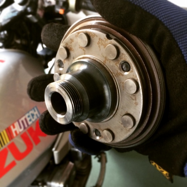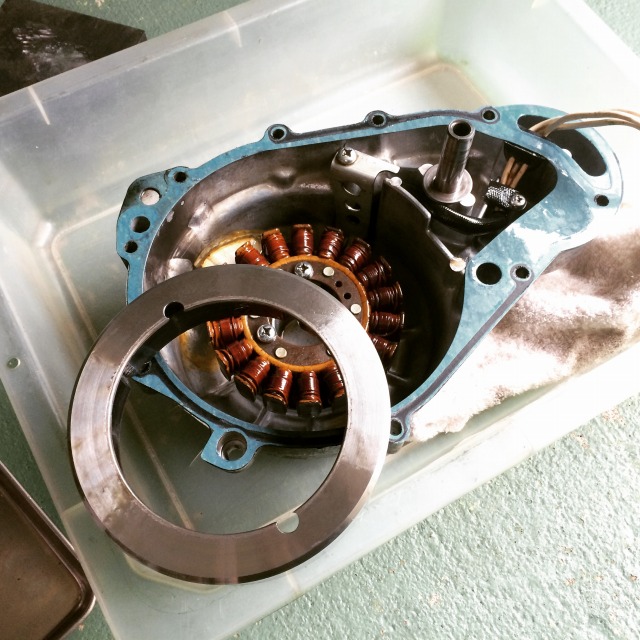 Ultimate lightweight flywheel!!! これぞ究極軽量フライホイールw 確かに、あの日は異常にエンジンの吹けが良かった。 磁石がもげて、ウエイトがほとんど存在しない状態なわけだから、そりゃ良く回転るよね。 さて、どーやって直すべか。 --- 幸い、数年前、SOHCエンジニアリングのw氏に譲っていただいたノーマルのフライホイールがある。 今まで付いていたクランクケースカバーは軽量フライホイールに合わせてカット加工してあるから使えないが、 これまた偶然にも、スペアのクランクケースカバーをオクで落札したばかり。 手元にある部品だけで直すことができそうだ。 さすがにフライホイールプーラーは持っていないので、 一度は完全に上がってしまったバッテリーを充電し直して(この際、1時間だけ走れればいい)、 再びHu-techに駆け込み、飛馬さんに組み直して貰った。