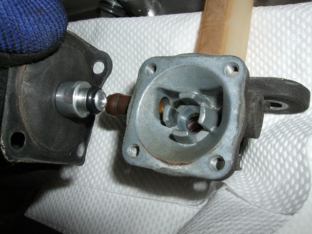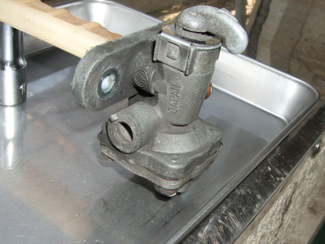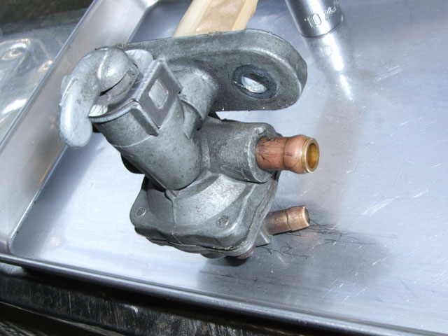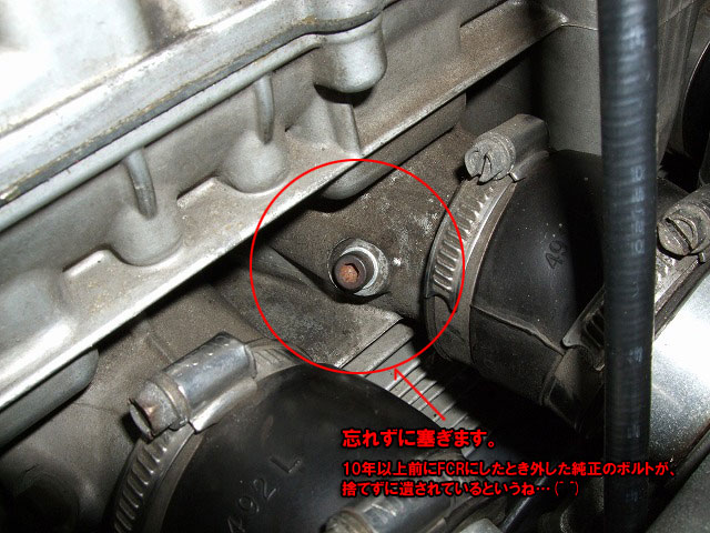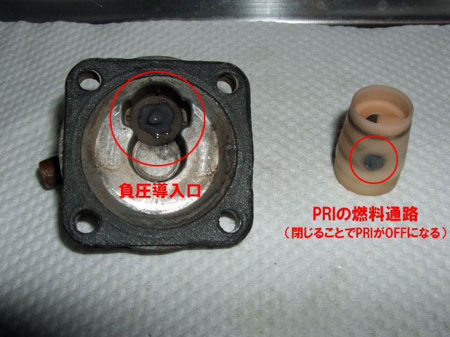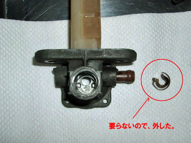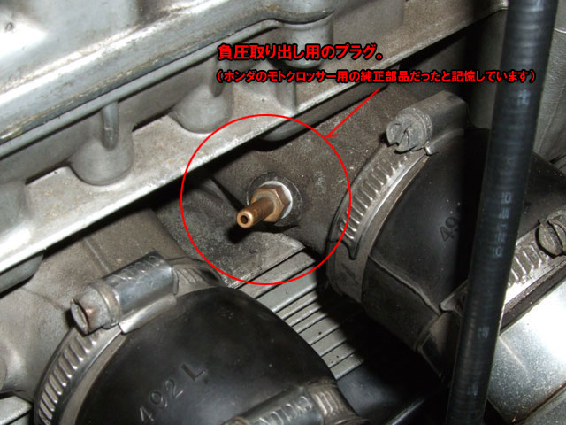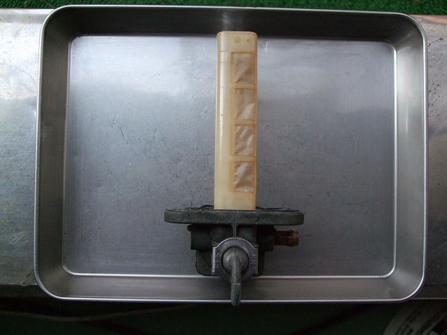 刀の燃料コックは、レース用キャブに換えて全開走行を続けると、 流量が不足してガス欠症状を起こすことがある。 具体的な例を上げると、全開加速5〜8秒ほどでエンジンがごぼつき始める。 こうなるとスロットルを戻してペースを落とすか、一旦、停まって休憩するしかない。 もちろん公道でそんな走りがそうそうできる筈もなく、 僕は、2年ほど前、友人の誘いで走った富士スピードウェイでこれを体験した。 厄介なのは、一度この症状が起きると、キャブの油面が落ちつくまで暫くまともに走れなくなることだ。 コックをPRIに切り換えても、すぐには快復してくれないんだよね。 実を言うと、似たようなことは以前にもあって、原因にも薄々気付いてはいたんだけれど、 そこまで頑張って走ることは滅多にないから、さほど気にかけていなかったわけ。
