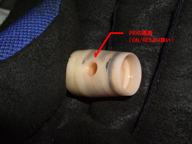 その走行会には、たまたままめしばさんが遊びに来ていたので、ちょっと相談して(ボヤいて)みた。 「あー、私も竜洋(※:スズキのテストコース)で経験したことあります」 「ピンゲル(※:米国製のハイフローコック)とかにしないと直りませんかねえ」 「ふつうに走るぶんには問題ないんだから、ン万円もお金をかけて対策するのはもったいないですよ。 GPZ900用のコックを流用するひとがよくいるみたいですが、(流量は)刀のコックとあまり変わらないと思いますね。 それより、負圧式コックはダイアフラムの作動範囲が狭いことがボトルネックになっているから、 手動式に改造しちゃえばいいんです」 「PRIにすれば(手動式のONと)同じことなんじゃないですか?」 「それがねえ。ON/RESよりPRIのほうが穴が小さいんですよ」 「まjっすか。でも、燃料コックを改造なんて…」 「バラしてみればわかりますが、そんなに複雑な構造じゃありません。 冬休みの宿題みたいな感じでちゃちゃちゃっと♪」 …てなわけで、2年ごしの宿題をやるです(笑) --- 純正キャブで流量不足が発生することは先ずないと思います。 レース用キャブでも、実際にガス欠症状を経験したことがないひとは、気にしなくていいと思う。 だって、不具合がないなら改造する必要ないじゃん。 手動コックは、OFFに戻すのを忘れてバイクを放置すると、 キャブがオーバーフローしてエンジンにガソリンが混入する危険があるからね。