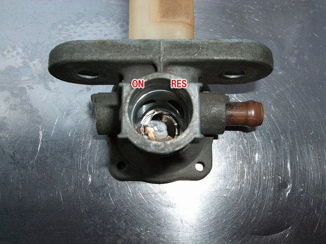 改造後の燃料コックは、“PRI”の位置が“OFF”となり、 “ON/RES”は通路全開!になります。もちろん、リザーブもちゃんと機能しますよ。 実走テストはまだそんなにできてないんだけれど、意外な効果として、始動性の向上が上げられます。 これは想像だけど、バイクを停めている間にもキャブの中のガソリンは徐々に気化して油面が下がっていくから、 特に長期間放置した場合なんかは、すぐにガソリンが落ちる手動コックの方が、 負圧コックより始動性に優れるんじゃないかな。 全開ガス欠病が治っているかテストしないとね。 さあて、どこでやるかな…。