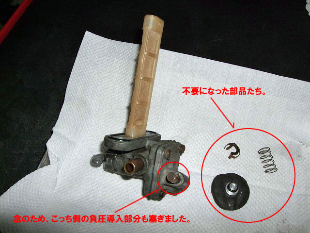 【後日談】 手動式燃料コックへの改造後、燃料不足が原因と思しきガス欠症状は一度も発生していません。 僕がときどきサーキット走行を愉しんでいる袖ヶ浦フォレストレースウェイには、 そのくらい開け々々で走っても、とりあえずガス欠症状は出なかったです。 --- ひとつ問題点らしきものがあるとすれば、 負圧コックが負圧で燃料を“吸い出す”のに対し、 とゆうわけで、この現象について真相の程は不明ですw (2013/04/24 追記) |