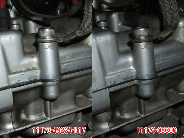 矢印ンとこ、ガスケットがズレての、わかります? ボルトは緩んでません。僕が組みつけをミスったわけでもない。 エンジンの内圧で押されて、飛び出してしまったんです。 噴き出したOilは、通風孔からエンジン前部に流れ、 シリンダーフィンをつたって、リアブレーキのマスタシリンダーにまで届いていた。 フレーム上部の配線回りにも飛び散って、タンクの裏はべったべた…。 タイアに付着しなかったのはラッキーだったよ。 袖走ってるときでもなくて良かった。 サーキットでこんなんなったら、顰蹙だもんね。 翌日、840mlのパーツクリーナーを3本も使って、やっとそこそこキレイになったところで、 ケータイが鳴って(りんりん)、やはり正月休みで暇を持て余していたMk.II乗りのブッチーさんが遊びに来たww ブ:「………!こんなの初めて見たよw」 僕:「ブリッピングすると、こっから“ぢわ、ぢわ”とOilが滲み出してくるッすw」 ブ:「刀は(吹き抜け)対策品のガスケット出てないの?Zだとメタルのがあるんだけれど」 それでちょっと調べてみた。 僕はちっとも知らなかったんだけれど………、 刀のヘッドカバーガスケットて………、国内仕様('94年型)で紙からメタルに変更されていたんですね。