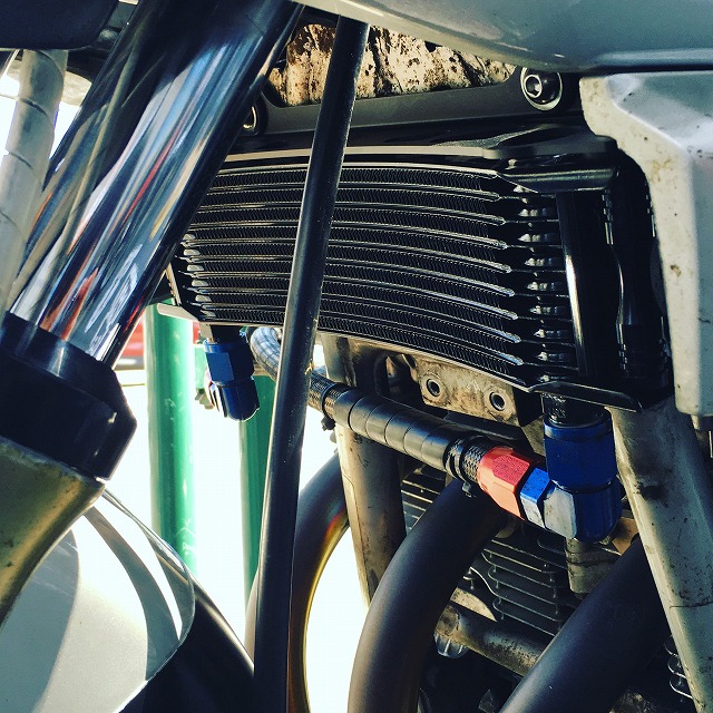 対策として、OilCoolerをラウンドタイプ(10段)に変更。 墨田のバイク屋に「エー!段数減らすのー!?」と突っ込まれ、最後まで大いに迷いましたけれど、 少なくとも僕の使用状況下においては、夏場でも大きな油温の変化はなかったです。 気温26〜28度くらいのある晩夏の一日。 高速100〜120kmのクルージングで80〜85度。街乗り移動中は90〜100度。 サーキットで95〜105度。 (ただし、クールダウン時には110度前後にまで上がります) これらはストレート型13段とほぼ変わらない温度です。 巨大なOilCoolerを付けていても、油圧をかけるOilポンプの能力が変わらなければ、 全段にOilを巡らせることができないため無意味という話をどこかで聞いたことがありますが、 意外とそのとおりかもしれない。 ストレート13段時代は、クルージング時に70度台前半のオーバークール気味になることも多かったから、 エンジンがノーマルなら、このくらいのサイズで充分なんでしょうね。 大きなコアから小さなコアに変更するひとはなかなかいないから、このデータは割と貴重でしょw もちろん、フェンダーとの干渉はありません。 オオノさんとこで13段のキット出してるから、ラウンド型なら13段でも干渉はないと思います。