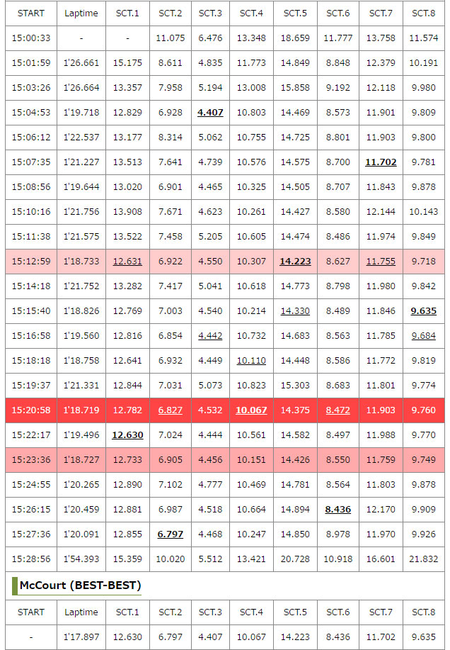 この回も割と混雑していて、クリアラップは僅か3周。 しかも悉く何処かでミスっちゃうとゆうね。 遅いバイクを縫いながらの走行でタイムのバラツキが多く、区間ベストを出している周回もバラバラ。 自己ベスト近辺の18秒台がボコボコ出てる。 ええ走り納めになりました。 ログ解析ソフトによると最高速は176.8km。 今年いちばんの伸びでFCRφ37時代と遜色なし。上等じゃないの。 涼しくなった気候のせいもあるけれど、口径が小さいCR-Mφ33でエアフィルターも装着したまま。 キャブと脚のセッティングが合って扱いやすくなったぶん、きちんと全開にできるようになったてことなのかな。 おそるべしCR-Mキャブレター。 実際のところ、気が付いたらスロットルがストッパーに当たっているなんて状態は、今年初めてだった。 ちょっと前まで、乗り手が意識して開けないと全開にできなかったんだよね。