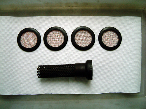 刀号の車検セット。 上に四つ並んでいるのはエアファンネル用のネットカバー。 下は、集合管のバッフル。 |