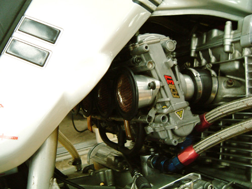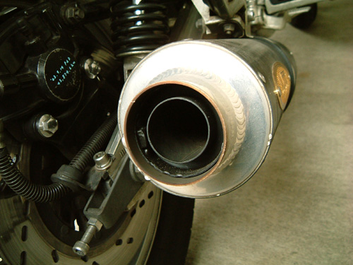 マフラーのエンドバッフルを装着した状態。外した状態の画像はこちら。 なしの方がスロットルレスポンスが全然鋭いので、ふだんは外して乗っている。 初めは僕も「やばい。煩すぎるかもしれない。」と思っていたが、キャブのセッティングが煮詰まるにつれて、 静かで、かつ好みの音質に近づいてきたのには驚いた。(慣れただけ?) |