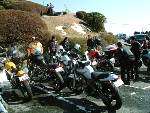 休日はビッグバイクやエンスー度の高いクルマで賑わう大観山PA。 この日は大快晴で、見事な富士山を観ることができた。 伊豆マイスターおぎん氏もここで合流。伊豆スカをただで走る方法をみんなに伝ぢゅ…。(もぐもぐ) | ||