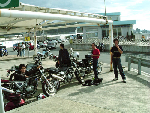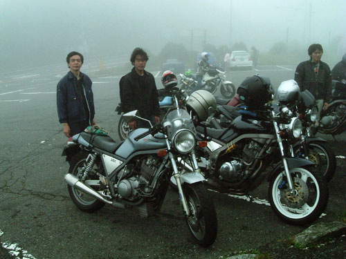 椿を駆け上がると、大観山は霧に包まれていた。降水確率がさほど高くなくてもman3を中止にする理由がこれ。 降っているようなら引き返すところだけど、幸い、雨は落ちていない。路面もドライ。 今日は、亀石になおや氏もやって来る。「雨もまたバイク!」とかのたまって。 そんな体育会系の人はお呼びではないので、そこんとこひとつ言っといてやらねばとの思いを秘め、出発。 | ||