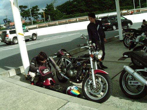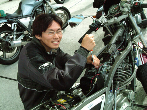 伊豆スカでは約二時間のフリータイム。 気になるバイクを試乗させていただいたり、セッティングを詰めたり…。 もしもし、すすむさん。ここでも開店ですか?(上が回らないとぼやきつつあのペース。謎。) | ||