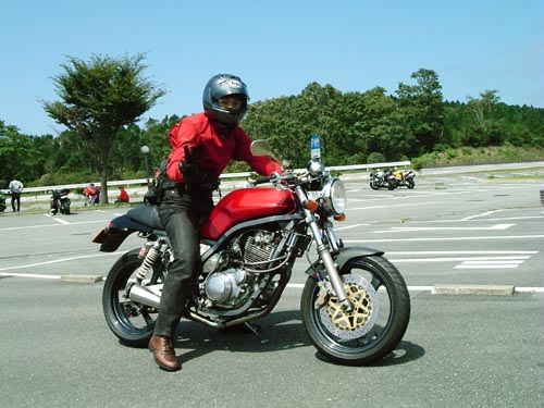 | 左の赤タンクの2型に試乗させていただきました。 排気直後でエキパイが集合する、メガアロイタイプのエグゾーストは管理人のかつての憧れ。 スーパートラップの金属を叩くような音質は正直あまり好きではないのですが、これはいい音してたなあ。 キャブはセッティング中なのか、パーシャルで少し淀むような感じがあったけれど、 アクセルを開け開けでライディングすれば、トルク感たっぷりに前に進みます。元気ないいエンジンだよ。 若い方もおられれば、ご年配の方もいらっしゃいます。62歳の老青春氏。 | ||