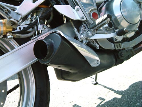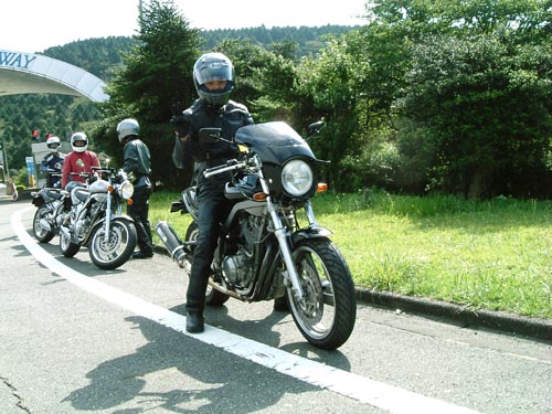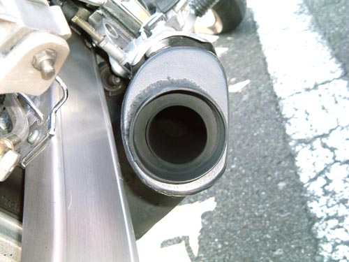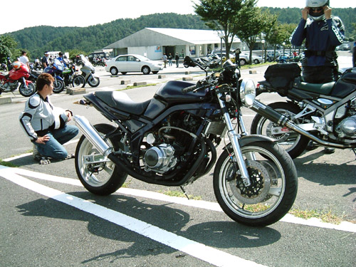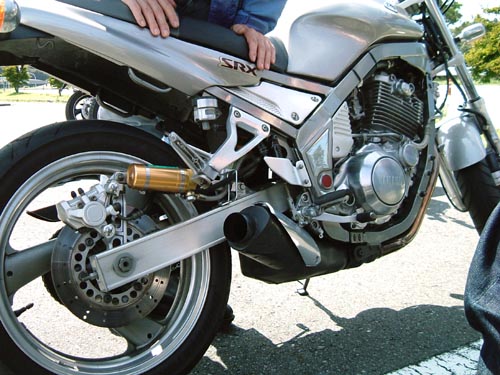 | 老青春氏のSRXには、マフラーにバンク角UPの秘策が。ステップのバンクセンサーもざっくりカット。 タイアは隅までどろどろだし、峠で会って、ぶち抜かれて、メットを脱いだお顔を拝見したらびっくりって感じかな。 みんなのチェックも真剣。「どーなってるの?」「中のエキパイをカットしてね。」「ふんふん。」 | ||